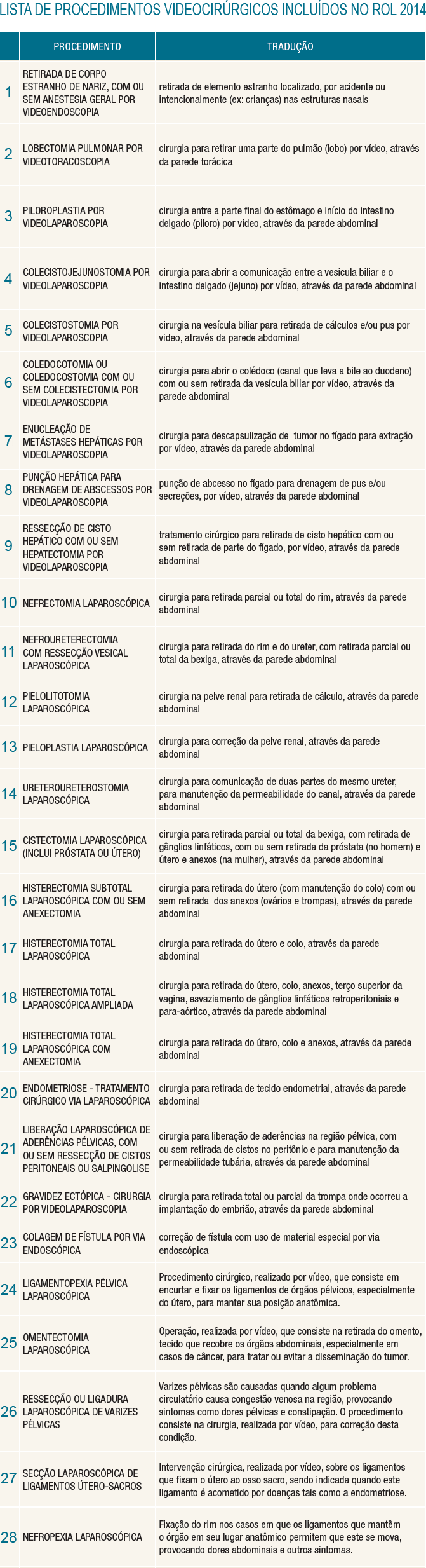 Vinte e oito crurgias por vídeo já fazem parte do rol de procedimentos dos planos de saúde. A inclusão, determinada pela Agência Nacional de Saúde (ANS), é resultado da união e da mobilização de médicos e pacientes na consulta pública realizada entre os meses dejunho e agosto deste ano. A ação foi iniciada por solicitação da SOBRACIL que desenvolveu campanha com o apoio do Colégio Brasileiro de Cirurgiões (CBC), com apoio da Sociedade Brasileira de Urulogia (SBU) e da Sociedade Brasileira e Cirurgia Torácica (SBCT). A consulta recebeu 7.340 contribuiçõies, a maior entre as 53 já realizadas pela agência.